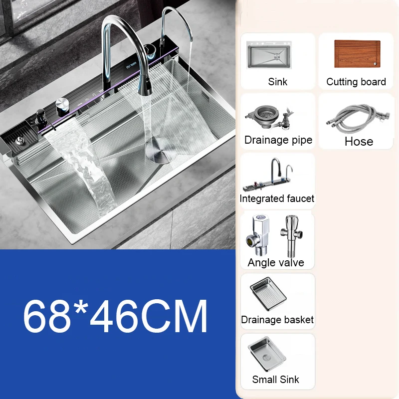Product news Product name: Smart kitchen sink Product material: chrome steel Product size: 68x46cm,75x46cm,80x46cm Product color: Black/Gold/White/Silvery Sink Style: Single bowl Product thickness: 3mm Product facets 1: Waterfall Faucet Design 2: Step sink design 3: Nano chrome steel materials 4: Wear resistance 5: Easy to clean 6: High temperature resistance 7: Increase skill 8: Three installation methods: Apron Front /Above Counter /Semi-inserted undercounter basin