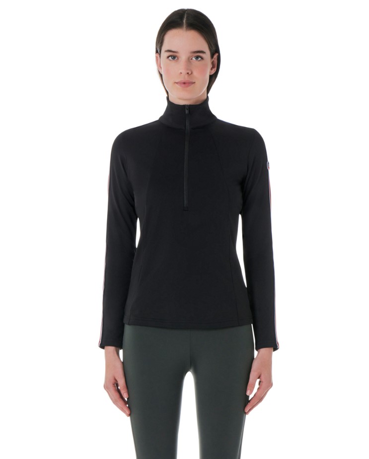 Half-zip stand-up collar base layer pullover adorned with a four-colour braid along the sleeves, STELLIA III is crafted from a soft powerstretch brushed on the inside for maximum warmth. TECHNICAL DETAILS stand-up collar Half-zip Four-colour braid along sleeve FABRICS Brushed powerstretch sweatshirt