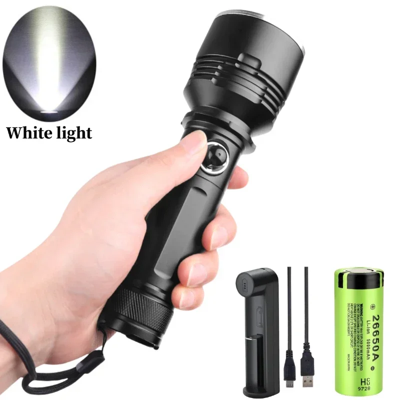 Features: 1: three modes dimming, compatible for various occasions. 2: Use 1 x 18650 or 26650 rechargeable battery, 26650 battery works longer 3: Made of aviation-grade aluminum alloy tough anodized, wear-resistant and seawater corrosion-resistant. 4: IPX8 waterproof, reputable diving flashlight design can dive as a lot as 800 meters 5: Yellow light, larger underwater penetration 6: Professional lighting fixtures kit for pro scuba diving lights, underwater fishing, salvage, underwater photography. Can even be used for camping, swimming, hiking, trekking, hunting, fishing and more. Product Description: LED lamp bead: XHP70 LED Lifespan: one hundred thousand hours Light color: yellow/white mild Lighting mode: steady light - weak gentle - flash Battery: use 1*18650/1*26650 lithium battery Size (cm): 18*5*3 kit List: 1 x diving flashlight 1 x 26650 Battery 1 x Hand rope 1 x USB cable 1 xBattery charger 1 x Gift Box