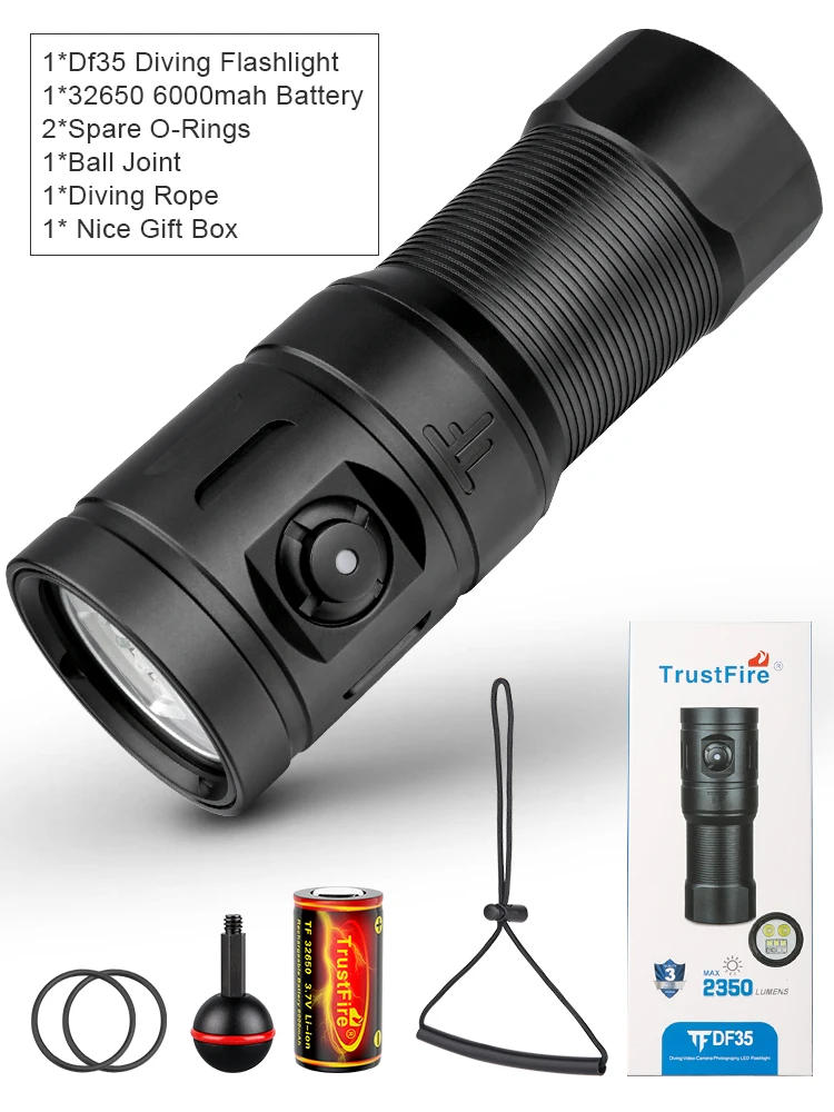 Trustfire DF35 Diving Torch Professional 2350Lumen High power 32650 Battery Led RED UV Underwater Lantern Scuba Cave Dive CaneraDF35 Dving digital camera pictures flashlightDF35 most 2350 lumens, most diving depth 70m, most fluctuate as a lot as 117m. Maximum 2350 lumens Maximum diving depth 70m Maximum beam fluctuate 117mMeet all desires of divingDF35 is a diving flashlight particularly for scuba diving, cave diving, unfastened diving and different underwater sports activities lighting kinds of LED mushy assets make interest of the sea worldDF35 adopts 3 diversified LED gentle sources and one-button neck type design; The 3 light resources are: UV light, purple light, white light, exploring the sea overseas interest, discovering the mysteries of the ocean. White gentle (Max 2350LM) Red light( wavelength 620nm) UV light( wavelength 395nm)Maximum diving intensity 70mDF35 has definite diving defense system, the max intensity of the 70M diving stress allows you to use it safely in the underwater structureDF35 makes use of 4 different mild beads and a one-touch button to show on flood, spot, purple and violet light. ON/OFF Battery indicator gentle Spotlight (550LM differ 117m) 2*XG2-3535 S4 Lamp beads Floodlight (can present one hundred fifty diploma extensive flood light) 3*XM2-5050 T6 Lamp beads UV mushy ( wavelength 395nm) 2*XPE UV LEDs Red gentle ( wavelength 620nm) 2*XE-3535 Red LEDs Ball jointWhite spotlight2* XG2-3535 lamp beads, white gentle (high mode) color temperature 5500K, Independent spot design, 550 lumens, 117 meters range, can give pleasant search results below water floodlight3* XM-5050 T6 lamp beads, white mild ( flooding) coloration temperature 5500K, up to 150 degrees flooding can give 2350 lumens of underwater lights light2* XE-3535 crimson gentle LED, wavelength 620nm, gift natural and efficient purple light, appropriate for underwater photography, inventive images fill smooth and crimson light-insensitive fish fill light light2* XPE UV LED, wavelength 395nm, natural UV light, correct for underwater photography of fish and corals with fluorescent substances, extra compatible for creative photography fill gentle one-button touch switchON/OFF: Under unlocked mode, prolonged press the side change for 0 seconds to turn ON/OFF. Mode change: When switched ON, click on the neck switch to alter modes from violet soft mode – pink gentle mode – high mode – low mode. SOS mode: When switched OFF, long press the change for 1 seconds to enter into SOS mode, click the switch to return to the working mode. Memory mode: When the sunshine is in any working mode, it will automatically memorize the current mode. After it's turned off, it will delivery working with the current reminiscence mode. Electronic click on error prevention [ Lock/Unlock ] Lock: When the sunshine is off, soon double-click replace enter into lock mode, after locking, it's going to flash two times in low light. Unlock: When the sunshine is below lock mode, soon double-click to unencumber and input the operating mode level battery indicatorPower indicator will illuminate when flashlight is ON, diverse color displays assorted final battery power, the corresponding courting as follows: Green 60%-100% Yellow 30%-60% Red 10%-30% Flashing red 0%-10% a: When the power is off, contact the switch, the battery indicator could also be displayed for two seconds via means of default. b: When the main mild is operating normally, the battery indicator lighting up for 1 second every single five seconds to indicate the current energy level selectionRecommended: Rechargeable lithium-ion battery with protective board (Trustfire-32650x series, etc.) Discreet use: Rechargeable lithium-ion battery (32650) Warning: 1. The 32650 battery is an business cells, now not secure and secure civilian battery, when the battery is of poor quality or improperly used (short circuit, excessive temperature, etc.) , It may well burn, explode and endanger own and estate safety. The use of excellent effective lithium-ion batteries with retaining board reduces risks in sure extents, the Trustfire series of batteries are recommended. 2. It is forbidden to fee the above non-recommended batteries or cells Features1/Professional pressure-resistant and water resistant structure design, diving protection depth as much as 70 meters 2/Professional pressure-resistant button design, even beneath 70 meters of water, can however achieve operation 3/Flood light, purple light, pink tender three-color fill delicate mode 4/Use the abroad patented LED, the existence span can attain 50,000 hours 5/Using 1pc 3/3 6000mAh Li-ion rechargeable battery 6/120 x 44mm(head diameter) 7/Net weight: 195(exclude battery) 8/Constant latest circuit, fixed brightness 9/Anti-reverse connection design to forestall the battery from being installed reversely that may trigger injury to the circuit 10/Non-slip body design 11/Made of aviation aluminum material, the outside is anti-wear processing with traumatic anodizing 12/Use double-sided anti-reflection coating tempered glass lens to efficiently lower gentle loss