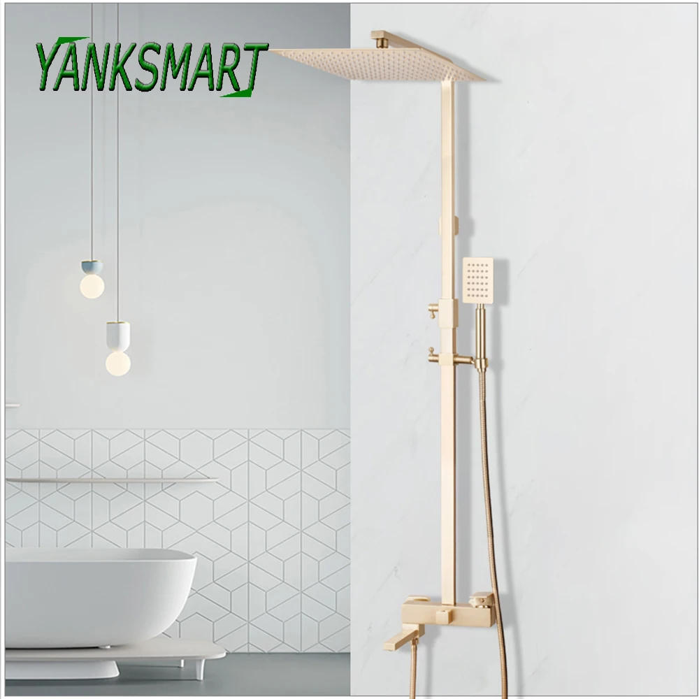 YANKSMART Brushed Gold Bathroom Shower Faucet Set Rainfall 12" Square Head Hand Showers System Wall Mounted Mixer Water Tap