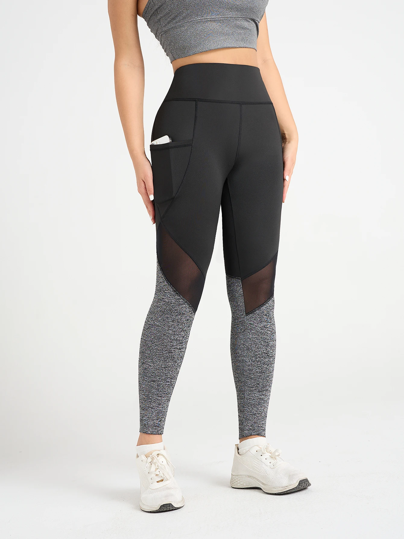 Sexy pocketed patchwork yoga pants and mesh fitness tights for women