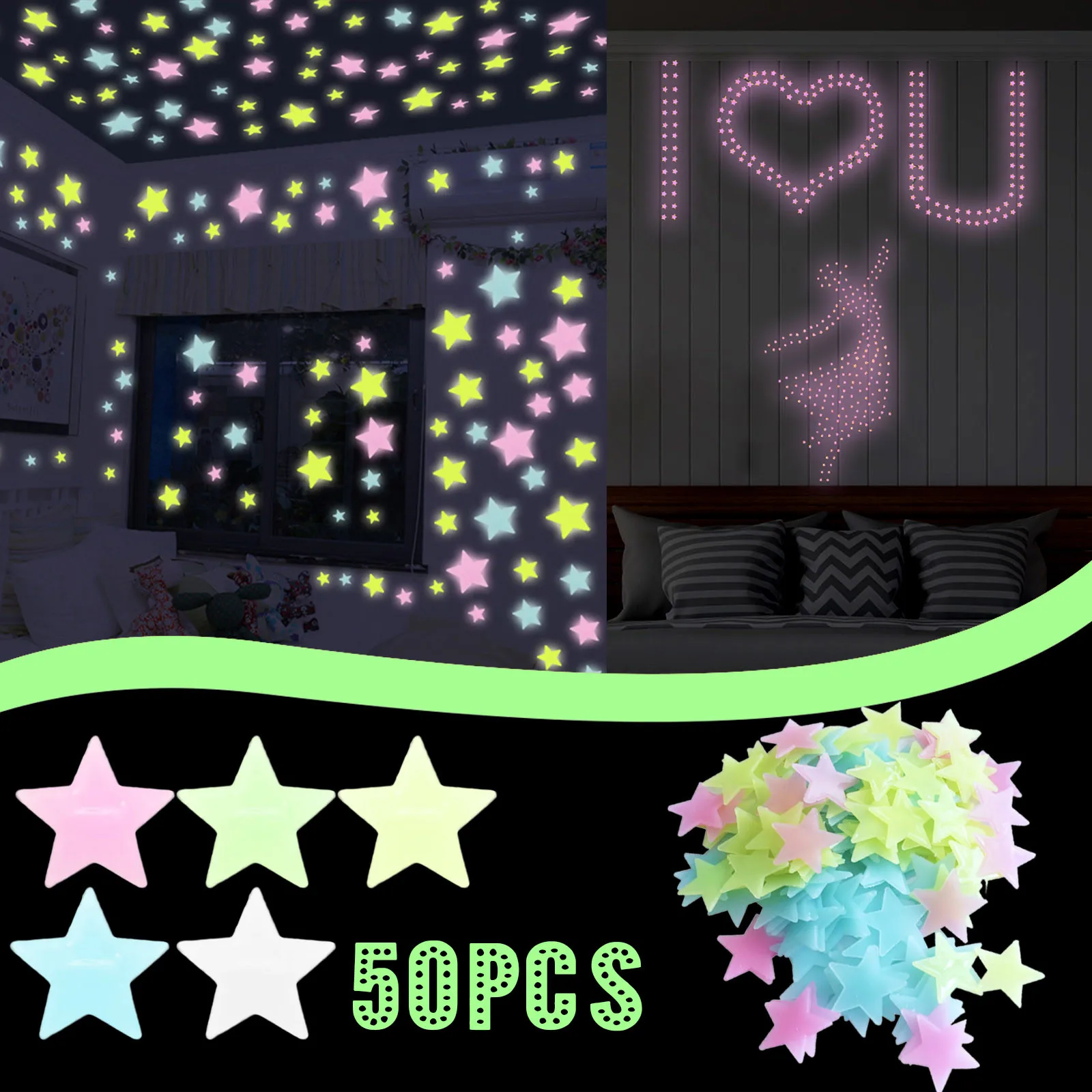 50Pcs 3D Stars Wall Stickers Glow In The Dark Sticker For Kids Baby Room Bedroom Ceiling Luminous Fluorescent Decals Home Decor